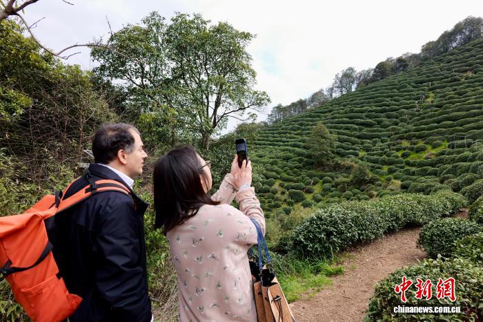 3月28日,市平易近乘客正在茶山上踩青。指日,浙江杭州西湖景色实胜区秋光恰好,吸收市平易近乘客踩青赏秋。中新社记者 钱朝菲 摄